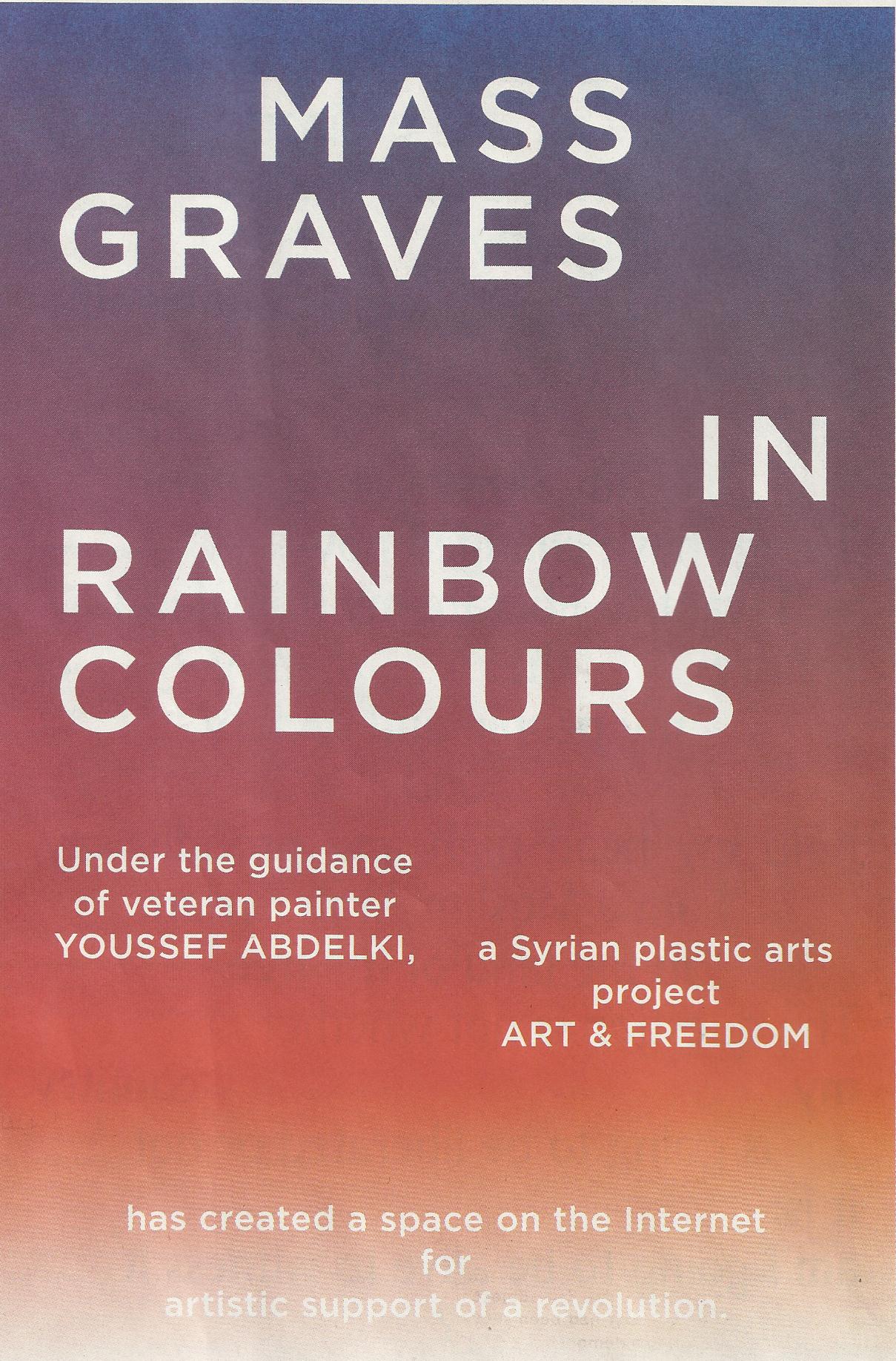 De Syrische revolutie is dan ook nauw verbonden met kunst. Drie maanden voordat de eerste demonstraties begonnen, maakte Ali Ferzat, een van de bekendste cartoonisten uit het Midden-Oosten, spotprenten van president Assad. Het was voor het eerst dat zoiets werd gepubliceerd, en daarmee werd er iets doorbroken.