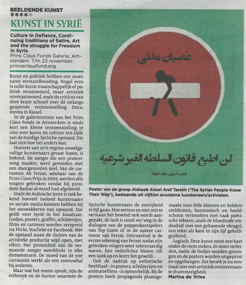 De tentoonstelling Culture in Defiance: Continuing Traditions of Satire, Art and the Struggle for Freedom in Syria is van 4 juni tot 23 november te zien in de Prins Claus Fonds Galerie, Herengracht 603, in Amsterdam