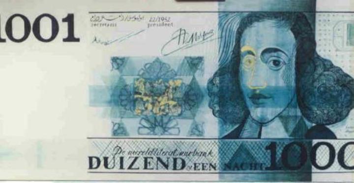 Een voorbeeld is het hier getoonde paneel uit de periode 1995-2000. Het werk verwijst naar het bankbiljet voor duizend gulden, waarop het portret van Spinoza staat weergegeven. Door kleine interventies is het beeld van betekenis veranderd. Het gebruikelijke 1000 gulden is vervangen met 1001 Nacht en ‘De Nederlandsche Bank’ is veranderd in ‘De Wereldliteratuurbank’. Het biljet is getekend door president N. Mahfouz op 22 juli 1952, de dag van de Egyptische revolutie en bovendien Nassars geboortedag. Een opmerkelijk detail zijn de met goudverf aangebrachte lijnen in het gezicht van Spinoza. Deze lijnen, die lopen vanaf het profiel van de neus via de rechter wenkbrauw naar het rechteroog, vormen het woord Baruch in het Arabisch, Spinoza’s voornaam. Op deze wijze plaatst Nassar een Nederlands symbool als het duizend gulden biljet in een nieuwe context. Spinoza was immers in zijn tijd ook een vreemdeling, namelijk een nazaat van Portugese Joden. Met een werk als dit stelt Nassar belangrijke vragen over nationale versus hybride identiteit en maakt hij een statement over de betrekkelijkheid van symboliek als een statisch referentiepunt van nationale identificatie. [3]