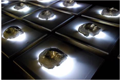 Qassim Alsaedy, object uit de serie/installatie Faces of Baghdad, assemblage van metaal en lege patroonhulzen op paneel, 2005 (geëxposeerd op de Biënnale van Florence van 2005). Afb. collectie van de kunstenaar