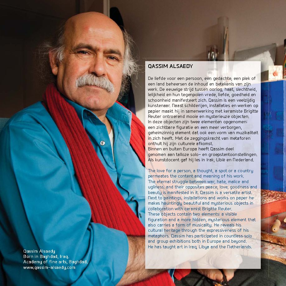 Een Iraakse kunstenaar, die sinds de laatste jaren steeds meer boven de horizon van ook de Nederlandse gevestigde kunstinstellingen is gekomen, is Qassim Alsaedy (Bagdad 1949). Alsaedy studeerde in de jaren zeventig aan de kunstacademie in Bagdad, waar hij een leerling was van oa Shakir Hassan al-Said, een van de meest toonaangevende kunstenaars van Irak en wellicht een van de meest invloedrijke kunstenaars van de Arabische en zelfs islamitische wereld van de twintigste eeuw. [7] Gedurende zijn studententijd kwam Alsaedy al in conflict met het regime van de Ba’thpartij. Hij werd gearresteerd en zat negen maanden gevangen in al-Qasr an-Nihayyah, het beruchte ‘Paleis van het Einde’, de voorloper van de latere Abu Ghraib gevangenis.