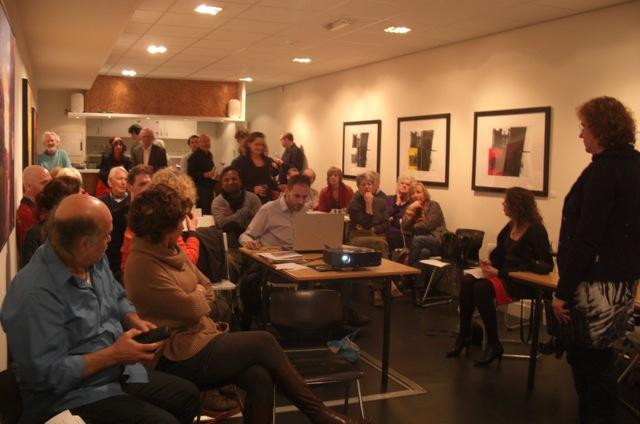 Left (in front) Qassim Alsaedy. Me behind the laptop. Behind me (left side) my sister Leonie Schreve and her partner Anand Kanhai. Behind them the Iraqi artist Ali Talib. Second right of me Brigitte Reuter, who created many works together with Qassim Alsaedy. On the walls (right) the work of Awni Sami