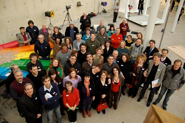 De kunstenares Louwrien Wijers en ikzelf. Linksachter Naji Rahim en Chris Keulemans