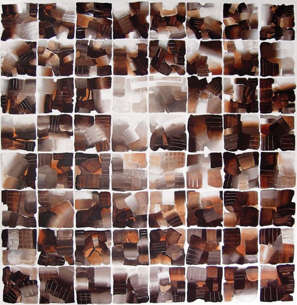 Although he opposed another American war against Iraq, with an uncertain outcome for its people, the end of the Ba’athist regime made it possible to visit his home country after many years of exile. In the autumn of 2003 he visited Iraq for the first time since his long absence in exile. His visit to iraq made a great impression and also influenced his work after. In the last series of paintings he made his use of colours changed dramatically. The explosive use of intense shades of red were replaced for a use of sober browns and greys. The dynamic compositions were changed in regular constructed forms. Also these works, from his last series, are represented on this exhibition.