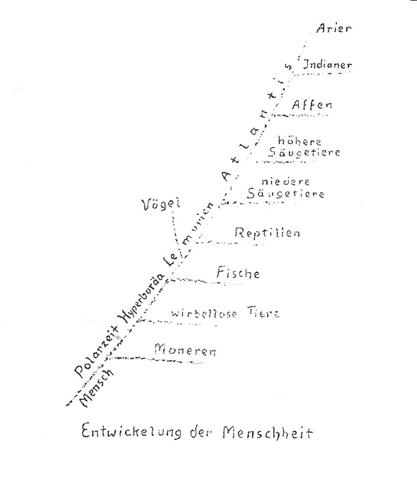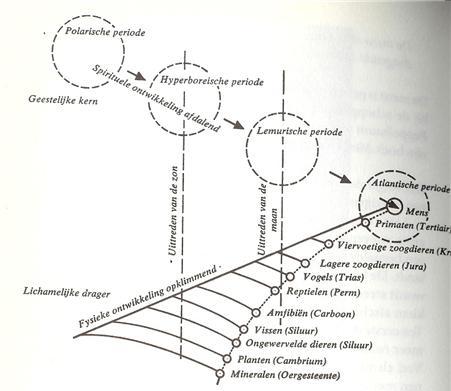 Volgens de Geheime Leer is de mensheid tot ontwikkeling gekomen in een aantal tijdvakken of aarde toestanden. In het begin zou de aarde nog nauwelijks een materiële verschijningsvorm hebben. Toch was de mens toen al aanwezig, zij het als geestelijke kern. In de loop der verschillende tijdvakken (Polaris, Hyperborea, Lemurië, Atlantis en het huidige na-Atlantische) zou de geest zich steeds meer hebben verdicht tot materie, tot onze huidige verschijningsvorm (aan het eind van de Atlantische periode). Opvallend is het gebruik van de term ‘Wortelras’ (‘root-race’ bij Blavatky, ‘Wurzelras’ bij Steiner). Er wordt gesproken van bijvoorbeeld het vierde wortelras (Atlantiërs) of het vijfde wortelras (Ariërs). Ook wordt er gesproken van ‘sub-races’ of ‘onderrrassen’, in ons na-Atlantische tijdvak van bijvoorbeeld het ‘oud-Perzische onderras’. Bedoeld wordt hiermee ‘cultuurperiode’, op dat moment de dominante cultuur in de mensheidsontwikkeling. De term wortelras is trouwens de sleutel tot het rassenbegrip van zowel HPB als Steiner, wat antroposofen en theosofen van nu ook mogen beweren. Het begrip wortelras zou niets te maken hebben met de huidige bestaande mensenrassen. Niets is minder waar. Er is wel degelijk een connectie. HPB legt dit heel duidelijk uit, zelfs geïllustreerd met de ‘Rassenboom’ (zie fig. 2, meer toelichting onderaan artikel), een soort stamboom (in ‘De Geheime Leer’, Deel II, ‘Antropogenesis’, ‘Eerste Gedeelte’, ‘Aanvullende commentaren op Stanza XII’, ‘De Rassenboom’, in de jubileum uitgave van de Theosofische Verening, afd. Nederland, Den Haag, 2e druk, 1968, p. 381, onderste helft van de pagina, met bovenstaand nog 19 regels tekst. Staat ook nog apart vermeld in de inhoudsopgave, dus je kan er niet omheen). Deze overdreven nauwkeurige bronvermelding omdat de commissie van Baarda beweerde dat bepaalde critici van HPB en Steiner niet in staat waren om de betreffende sleutelpassages precies aan te wijzen in HPB’s duizenden pagina’s tellende werk, waarbij de paginanummering, toegeven niet heel erg praktisch, per subgedeelte weer opnieuw begint. Hiermee probeerde de commissie zelfs de integriteit van deze critici in twijfel te trekken. Bij deze dus. Overigens noemt ze op de tegenover liggende pagina ervoor (p. 380) de ‘Aryo-Atlantiërs’, of het ‘Arische Ras’, het ‘Vijfde Wortelras’ (de filosoof Bram Moerland wijst hier ook al op in zijn brochure ‘Rassenleer met charisma’, uit 1989, p. 10). Ook op p. 688 spreekt zij nadrukkelijk van het ‘blanke, Arische, vijfde wortelras’, dat zij afzet tegen het ‘gele ras en het Afrikaanse negerras, met hunne kruisingen’, waarna zij vervolgt met de mededeling dat ‘Roodhuiden, Eskimo’s, Papoea’s, Australiërs, Polinesiërs, enz. enz. zijn allen aan het uitsterven. Zij die inzien dat elk wortelras een toonladder van zeven onderrassen doorloopt zullen het ‘waarom’ begrijpen. De incarnerende ego’s zijn aan hen voorbij gegaan, om ondervinding te doen in een beter ontwikkelde en minder door ouderdom versleten stammen, en hun vernietiging is derhalve een Kharmische Noodzakelijkheid’. Deze uitspraak liegt er niet om lijkt me, overigens geheel correct geciteerd door Bram Moerland op p. 13. Weliswaar zijn de wortelrassen uit de eerdere werelden nog niet stoffelijk (Steiner en Blavatsky spreken van een geleidelijke evolutie van een geestelijke, immateriële verschijningsvorm naar de stoffelijke vorm die we nu kennen), maar de stoffelijke verschijningsvorm heeft in de Atlantische tijd haar vorm gekregen. Dus als er vanaf dat moment van ‘rassen’ wordt gesproken kunnen we veilig aannemen dat het over het rasbegrip gaat dat we nu kennen. Vandaar Steiners opmerkingen over de Indianen, van wie het beendergestel te vroeg verhardde. De indianen hadden dus al in een te vroeg stadium hun materiële verschijningsvorm gekregen en ‘zijn nu decadent geworden’. Hoe dit precies zit is een van de lastigste aspecten van de antroposofie (en theosofie). Het beste kan ik verwijzen naar een schema, uitgetekend door de bioloog en antroposoof Hermann Poppelbaum in 1928 (zie fig. 3, toelichting onderaan artikel). Ook de Brug, nooit te beroerd om de zaken duidelijk uit te leggen, vat de geschiedenis van de Atlantiërs en de Ariërs nog eens bondig samen in het artikel met de buitengewoon sympathieke en veelbelovende, alsmede à-historische en onzinnige titel ‘Waarom geen Chinese cultuurperiode?’ ( slechts 5000 jaar beschavingsgeschiedenis, dit terzijde http://users.pandora.be/antroposofie/diabasis/b18chincul.htm). Let op de bijna aandoenlijke mededeling ‘De moderne wetenschap vindt de geesteswetenschap al sowieso onzin’. En terecht lijkt me, zeker in dit geval. maar we wisten al dat Ahriman zich ook had genesteld in de moderne wetenschap. Bij dit onthullende artikel is ook een kaartje weergegeven waarop heel duidelijk wordt aangegeven waar de bron van het Arische ras zich zou bevinden (cruciaal voor zowel Steiner, Blavatsky als de ‘Ariosofie’). In het begeleidende artikel vinden we het volgende Steinercitaat: ‘Alles wat bij de Toeraniërs decadent was, werkte eliminerend en omvormend bij het Hebreeuwse volk’, uit ‘Het Mattheus-Evangelie’ (niet te verwarren met het Evangelie uit de Bijbel, maar Steiners lezingencyclus uit 1910). Dit lijkt waarempel nog een antisemitische uitspraak. Steiner vervolgt met: ’dat de oude Atlantische helderziendheid bij de Hebreeuwen zich niet manifesteerde in een lager astraal helderzien, maar naar binnen sloeg en het innerlijk leven organiseerde’. Verder zegt Steiner: ‘De prometheïsche denkkracht, die de Arisch-Kaukasische mensheid in de na-Atlantische periodes moest ontwikkelen, wordt vooreerst met het hoge rotsgebergte van het hoofd verbonden, het Jupiter-denken krijgt een zetel in de hersenen’. Dit soort praat kenden we al uit ‘de Volkszielen’. Wat is die ‘Brug’ toch een bruikbare bron van informatie, hoe alle