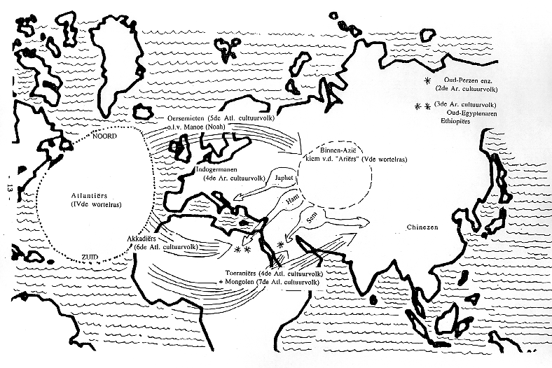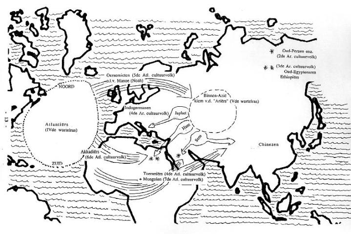 De prehistorie volgens de antroposofie, na de ondergang van Atlantis (volgens een kaartje uit ‘de Brug’, bij het artikel ‘Waarom geen Chinese cultuurperiode?’). Hoewel het met de grote lijnen al flink mis is, is het aardig om te zien hoe dit zich ook vertaalt tot in de kleinste details. De ‘Akkadiërs’ bijvoorbeeld, zijn Semitisch (het Akkadisch is de oudste bekende Semitische taal uit Mesopotamië). Hoewel ‘de Brug’, met hun Holocaustontkenningen en verhandelingen over UFO’s, wellicht kan worden afgedaan als een extremistische rariteit binnen het hedendaagse spectrum van de antroposofie geeft dit kaartje een getrouwe weergave van wat er wordt beschreven in het eerste hoofdstuk van Steiners ‘Akasha-kroniek’.