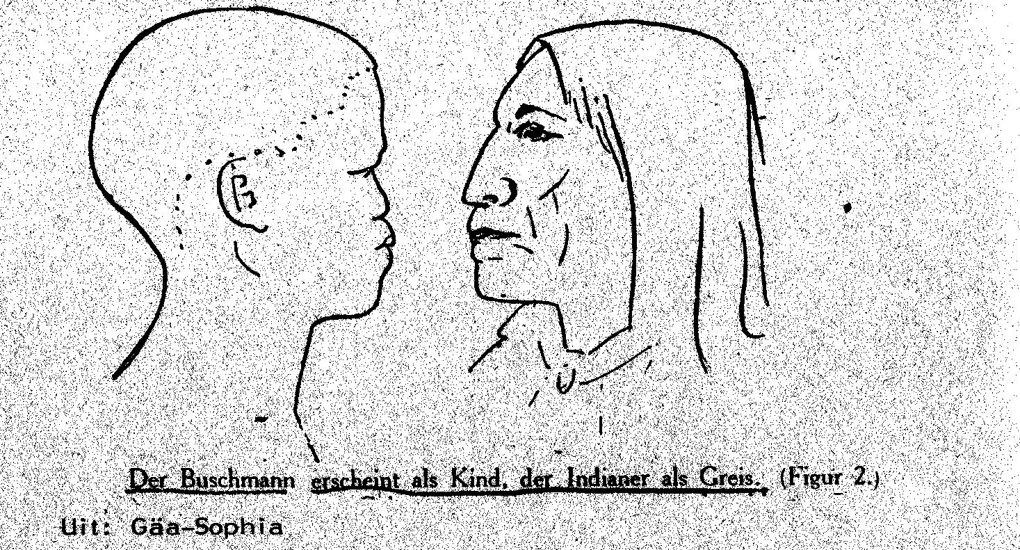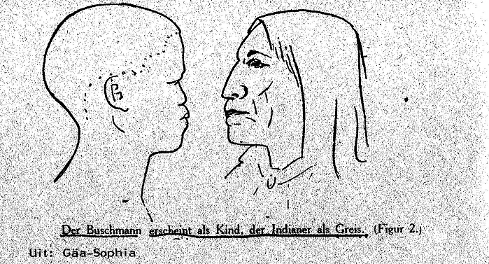 Maar Steiner gaat verder. Niet alleen kunnen de rassen gekoppeld worden aan de specifieke krachten der planeten, ook kunnen de eigenschappen van een bepaald ras gekoppeld worden aan een specifieke leeftijdsfase van de mens. Hierin beperkt Steiner zich tot vier hoofdrassen. In het zwarte ras, ten eerste, zijn vooral de krachten van het kind werkzaam. In het Aziatische ras (zowel het Maleise als het Mongoolse ras) staat de geestelijke ontwikkeling gelijk aan die van de puberale leeftijdsfase. Het blanke Europese ras staat synoniem voor volwassenheid en inderdaad, de indianen staan voor ouderdom. ‘Diese Linie ( zie fig. 1) besteht auch für unsere Zeit. Der Afrikanische Punkt entspricht denjenigen Kräften der Erde, welche dem Menschen die ersten Kindheitsmerkmale aufdrücken, der asiatische Punkt denjenigen, welche dem Menschen die Jugendmerkmale geben, und die reifsten Merkmale drückt dem Menschen der entsprechende Punkt im europäischen Gebiete auf. Das ist einfach ein Gesetzmäßigkeit. Da alle Menschen in verschiedenen Reinkarnationen durch die verschiedenen Rassen durchgehen, so besteht, obgleich man uns entgegenhalten kann, daß der Europäer gegen die schwarze und die gelbe Rasse einen Vorsprung hat, doch keine eigentliche Benachteilung. Hier ist die Wahrheit zwar manchmal verschleiert; aber Sie sehen, man kommt mit Hilfe der Geheimwissenschaft doch auf merkwürdige Erkentnisse”. Merkwaardig is het inderdaad, maar duidelijker kun je het niet krijgen. ‘Het is gewoon een wetmatigheid’. Maar hij gaat door: “Dann sehen wir später eine Herüberbewegung des Menschen nach der westlichen Richtung, und in der Verfolgung der rassebestimmende Kräfte nach Westen können wir dann das Absterben in den Indianen beobachten. Nach Westen mußte die Menschheit gehen, um als Rasse zu sterben.” (p. 81-82). Zie hier de kern van Steiners racisme. Het lijkt allemaal kraakhelder en ook zo diepziepzinnig, maar is, als je er even over nadenkt, allemaal gebaseerd op vrijblijvend associatief geklets, geschraagd met irrelevante vergelijkingen en astrologie. Je zou er je schouders over kunnen ophalen als het om onschuldige geneeskrachtige kruiden zou gaan, of leuke horoscoopjes trekken, maar hier wordt toch echt met ‘kosmische argumenten’ de genocide op de oorspronkelijke bevolking van twee continenten als een wetmatigheid en zelfs een noodzakelijkheid gepresenteerd.