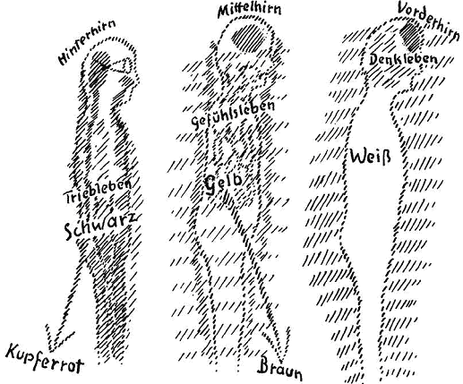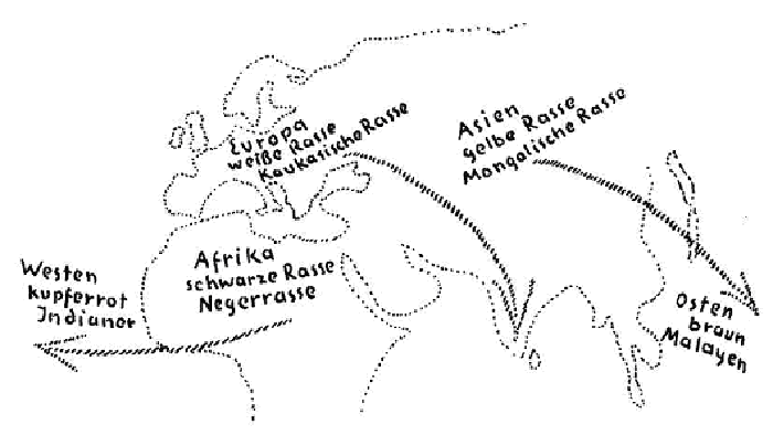 Figuur uit de Volkszielen, als illustratie bij citaat: ‘Diese Linie Besteht auch für unsere Zeit. Der Afrikanische Punkt entspricht denjenigen Kräften der Erde, welche dem Menschen die ersten Kindheitsmerkmale aufdrücken, der asiatische Punkt denjenigen, welche dem Menschen die Jugendmerkmale geben, und die reifsten Merkmale drückt dem Menschen der entsprechende Punkt im europäischen Gebiete auf. Das ist einfach ein Gesetzmäßigkeit. Da alle Menschen in verschiedenen Reinkarnationen durch die verschiedenen Rassen durchgehen, so besteht, obgleich man uns entgegenhalten kann, dasz der Europäer gegen die schwarze und die gelbe Rasse einen Vorsprung hat, doch keine eigentliche Benachteilung. Hier ist die Wahrheit zwar manchmal verschleiert; aber Sie sehen, man kommt mit Hilfe der Geheimwissenschaft doch auf merkwürdige Erkentnisse”. Bron: Rudolf Steiner, Die Mission einzelner Volksseelen im zusammenhange mit der Germanisch-Nordischen Mythologie, Nachlassverwaltung im Selbstverlag, Dornach, 1950, p. 80.